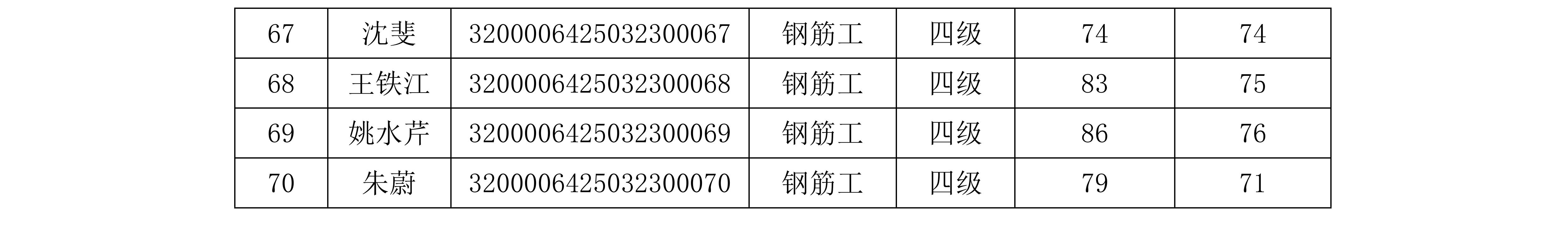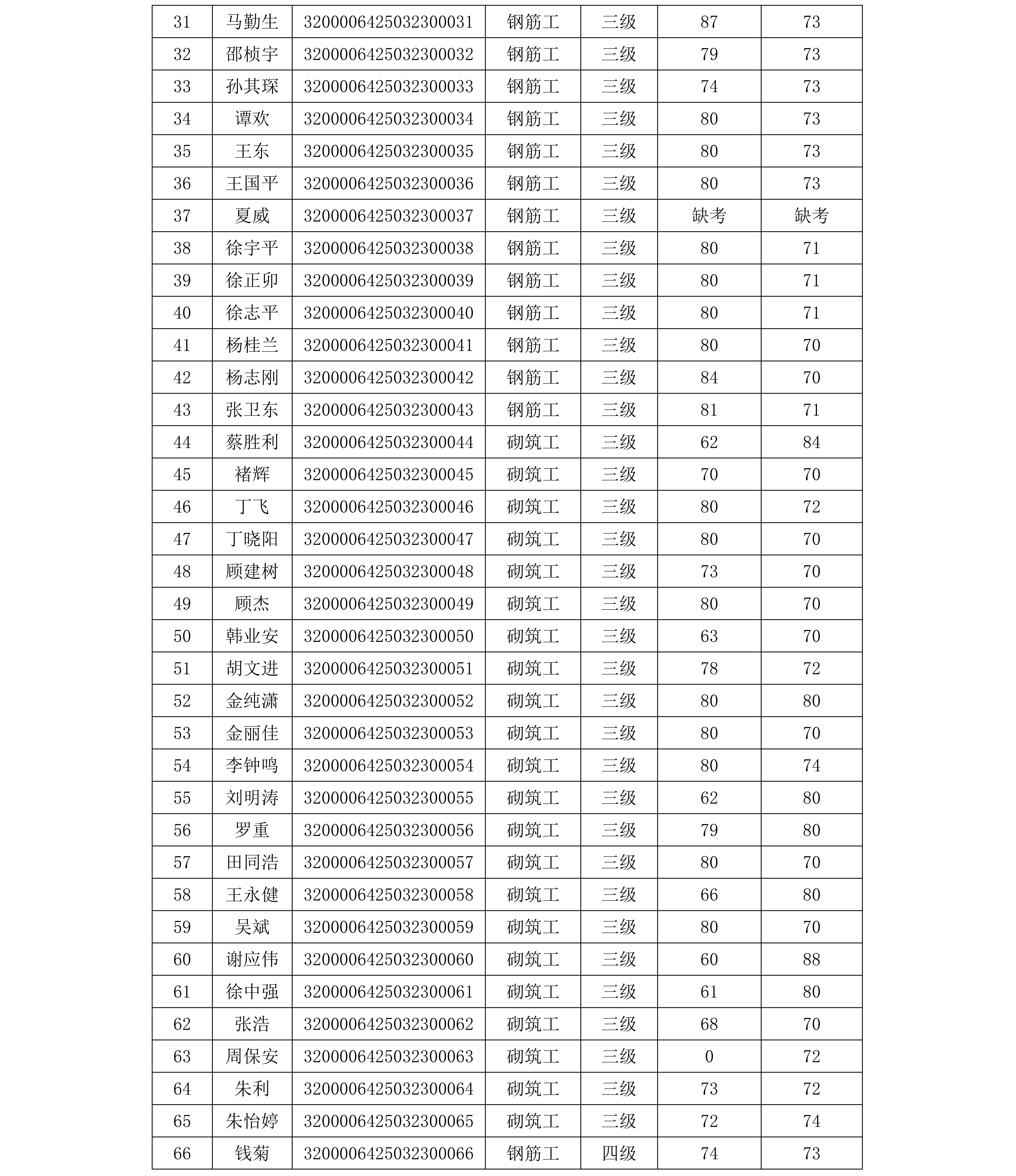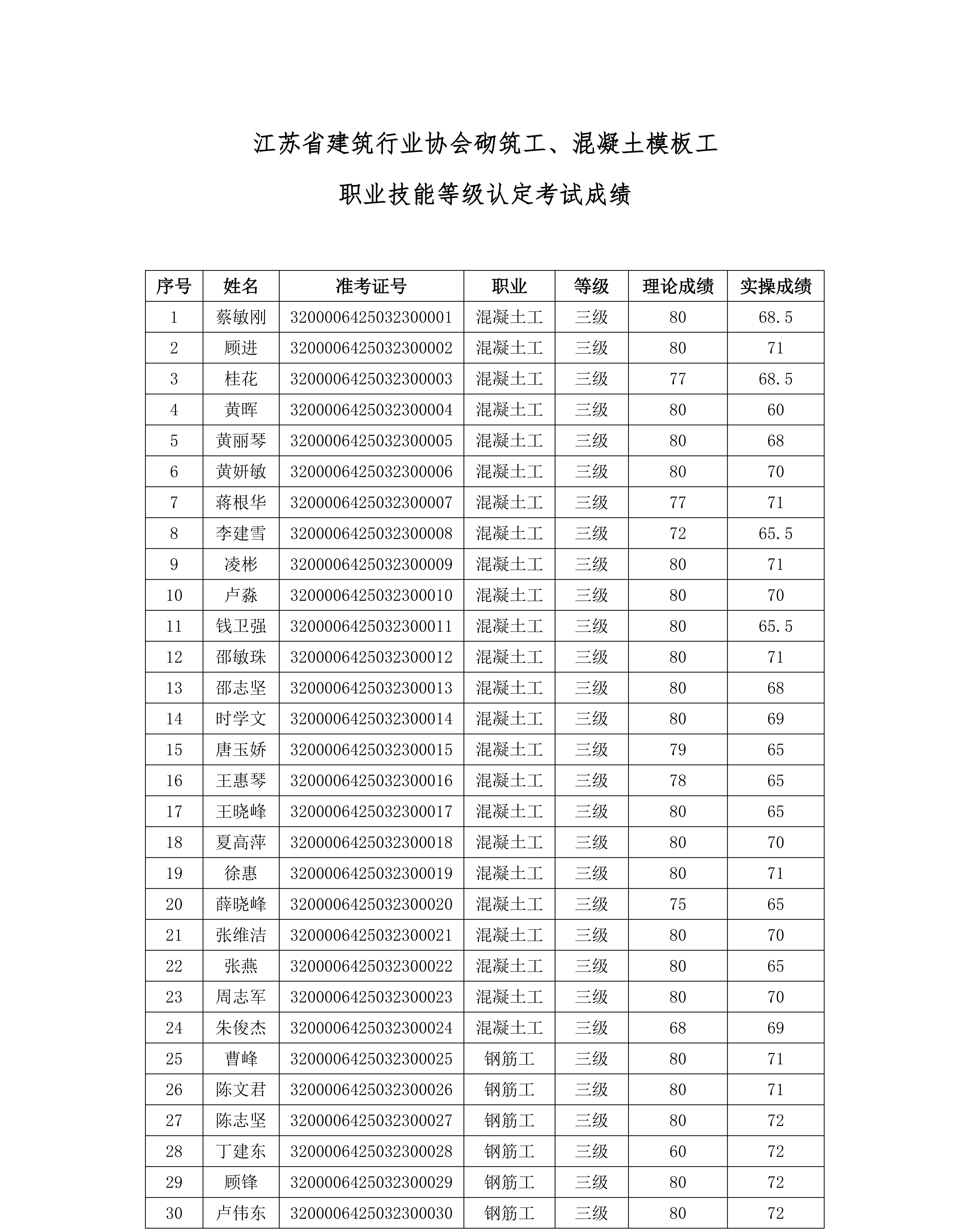 現(xiàn)將2025年3月23日江蘇省建筑行業(yè)協(xié)會砌筑工、鋼筋工、混凝土模板工職業(yè)技能等級認(rèn)定(考試批次號為:2025-32000064-0003)考試成績公示如下,公示期5天,如有疑問,請聯(lián)系025-86555932。