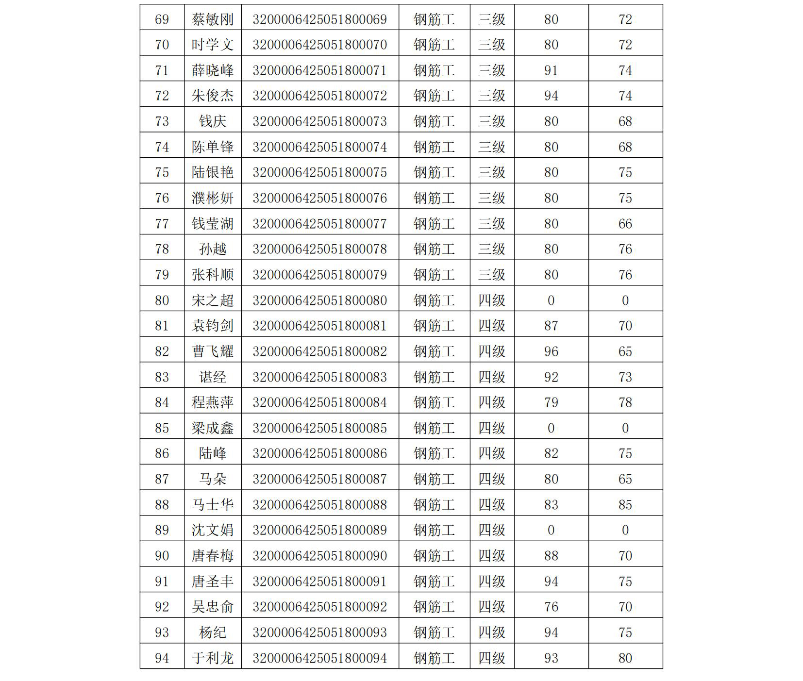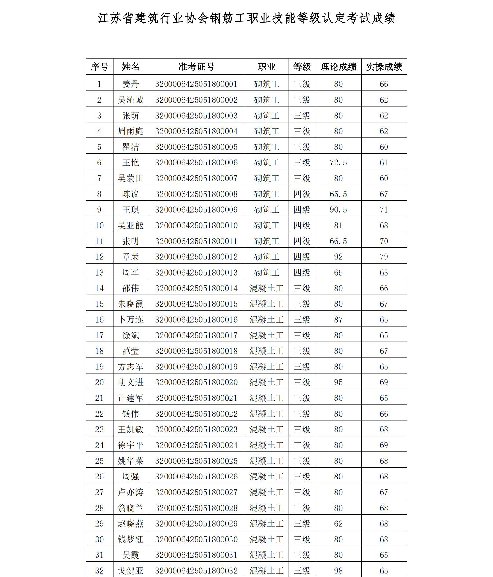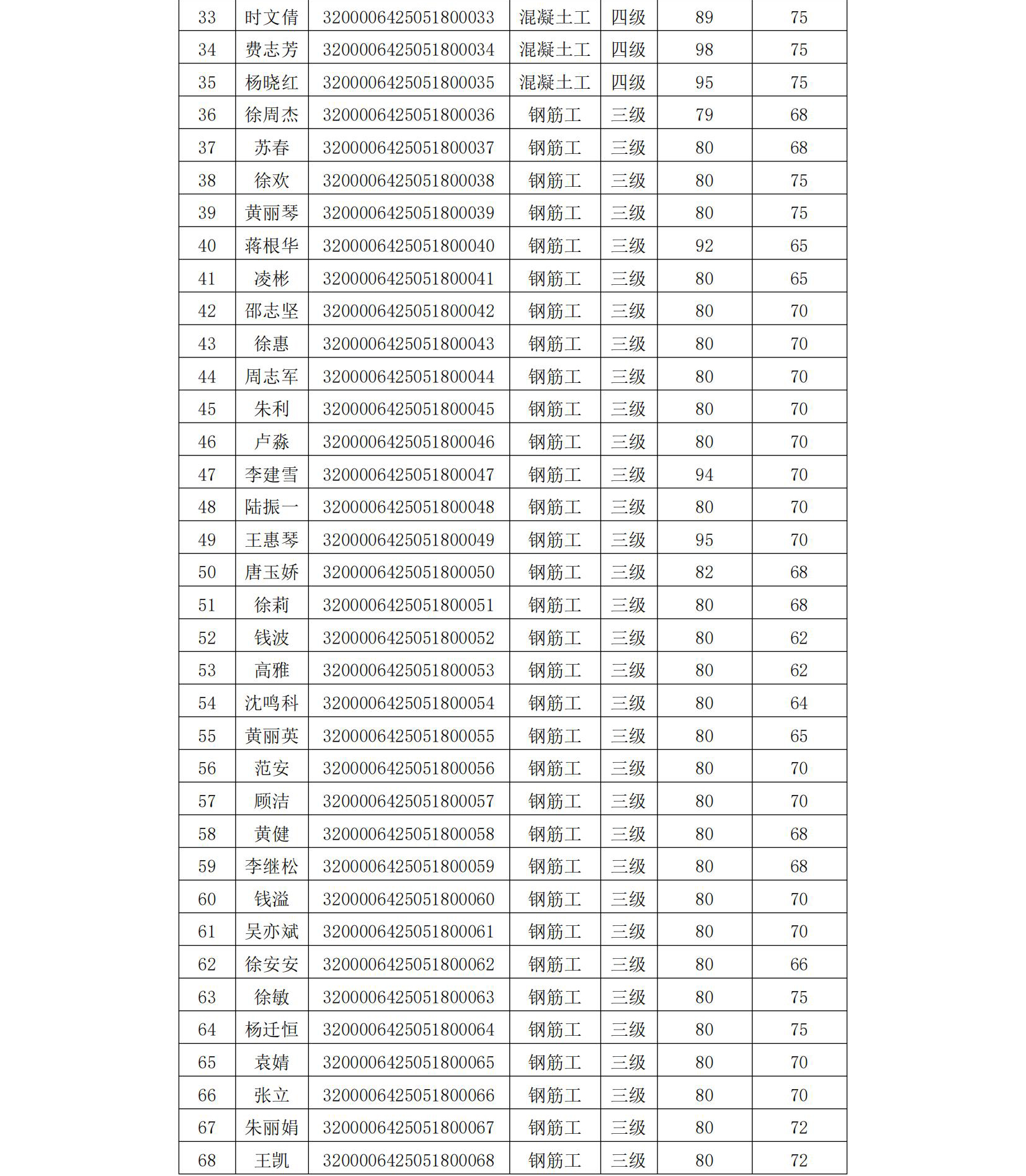 我會于2025年5月18日組織開展了鋼筋工二級職業(yè)技能等級認(rèn)定(認(rèn)定批次號:2025-32000064-00006),現(xiàn)將考試成績公示如下,公示期5天。